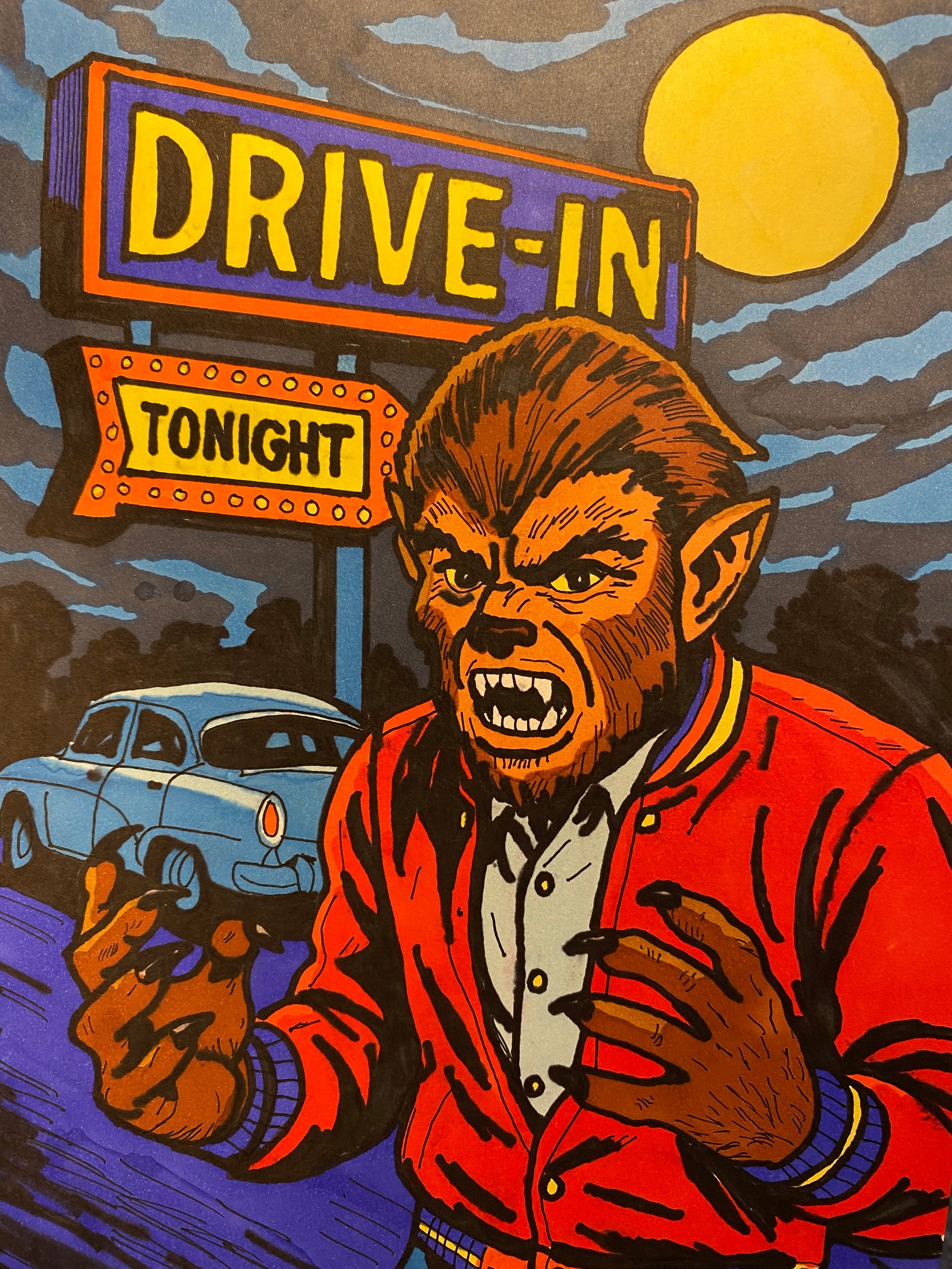 Teenage Werewolf at the Drive in Cinema. Inks on A4 paper original Artwork by Kristian Rodriguez K-ROD. Comes boarded and with protective plastic sleeve.